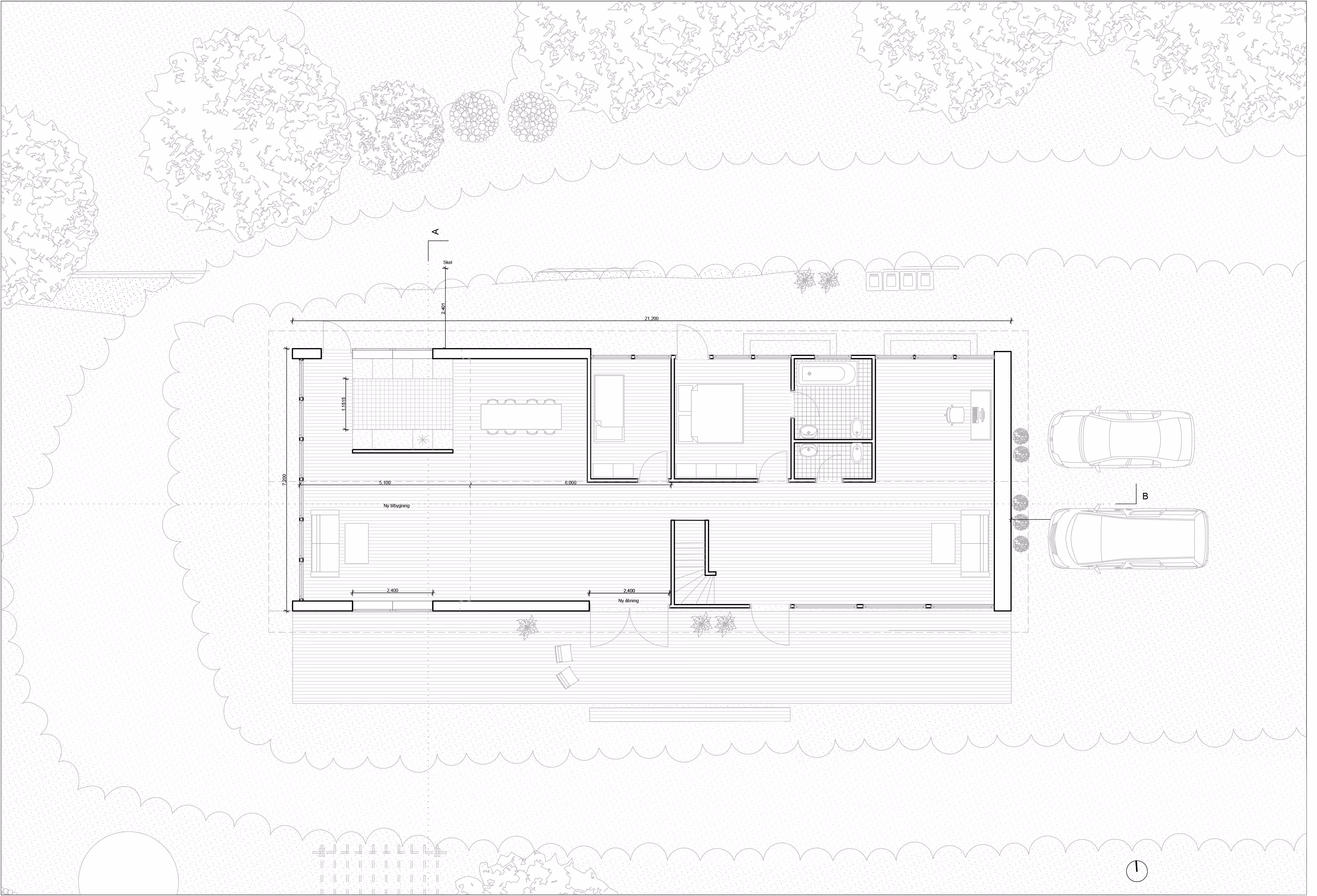 Projektet består i, at skabe en tilbygning / forlængelse af 60'er huset i Birkerød samtidig med at husets ydervægge og tag bliver efterisoleret. Boligen forlænges mod vest for at skabe mere plads til familien. Køkkenet flyttes og gør samtidig plads til en ny mindre åben spisestue. "Bagsiden" af køkkenet danner afskærmning til den nye forlængede stue således at de to dele af huset kan fungere uden at forstyrre hinanden. Der etableres dør fra køkken ud til det fri på nordsiden af huset. Alle vinduer udskiftes til mahognivinduer - gulv-til-loft. Taget efterisoleres og samtidig lægges der ny tagbeklædning. Ydervæggene i tegl forlænges med genbrugstegl fra tidligere carport således at der skabes en flydende "usynlig" overgang mellem den nye og den gamle teglfacade.